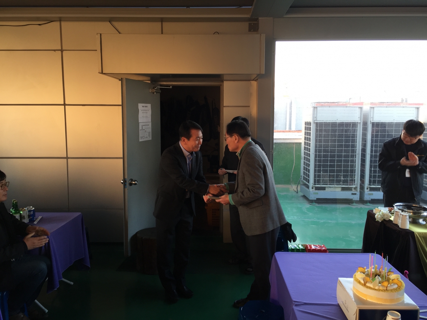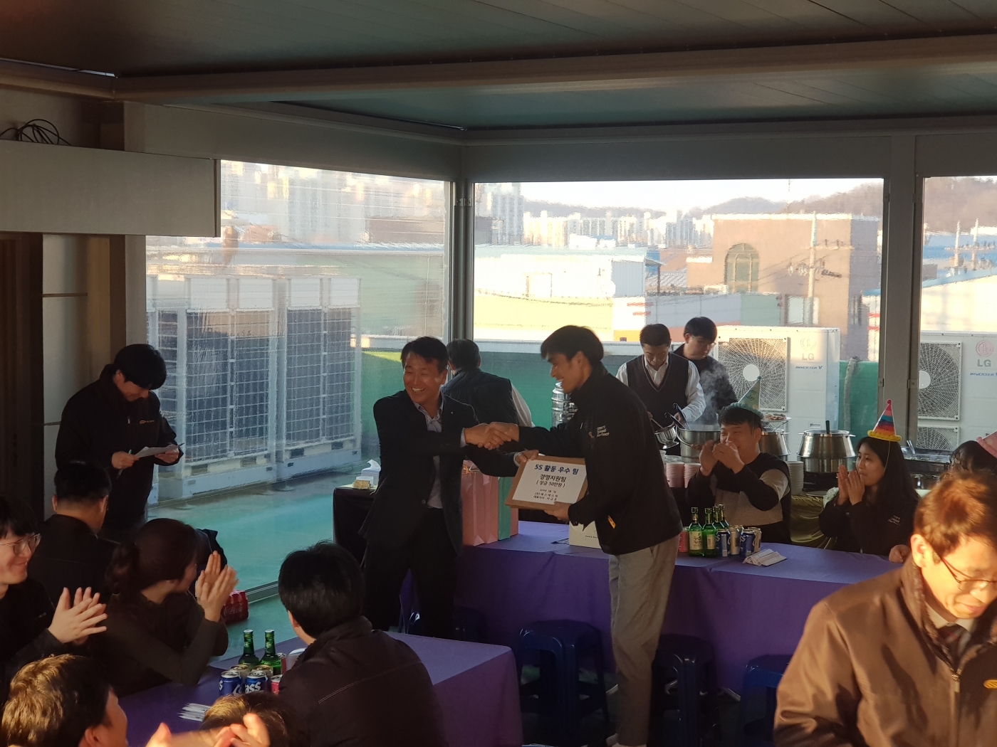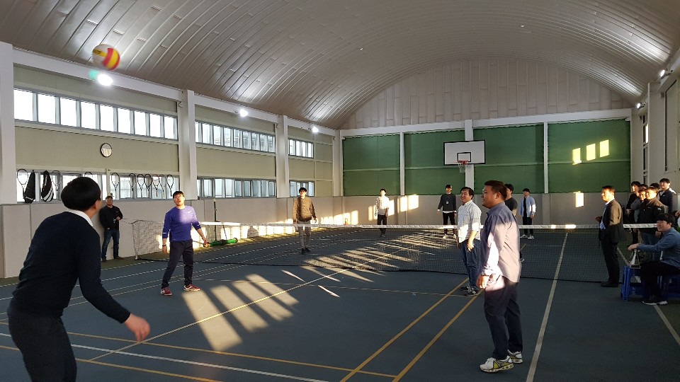 행사 전 체육관에서 직원들간 팀웍과 친목 도모를 위한 족구 경기를 하였으며, 기술연구소가 승리의 기쁨을 누렸습니다. 대표님께서 사무실/작업장 정리정돈 관리를 철저히 수행한 기구설계팀, 경영지원팀에 대해 5S 포상을 실시하셨으며, 생일을 맞이한 직원들에게 격려의 말씀과 축하 선물을 전달하셨습니다.