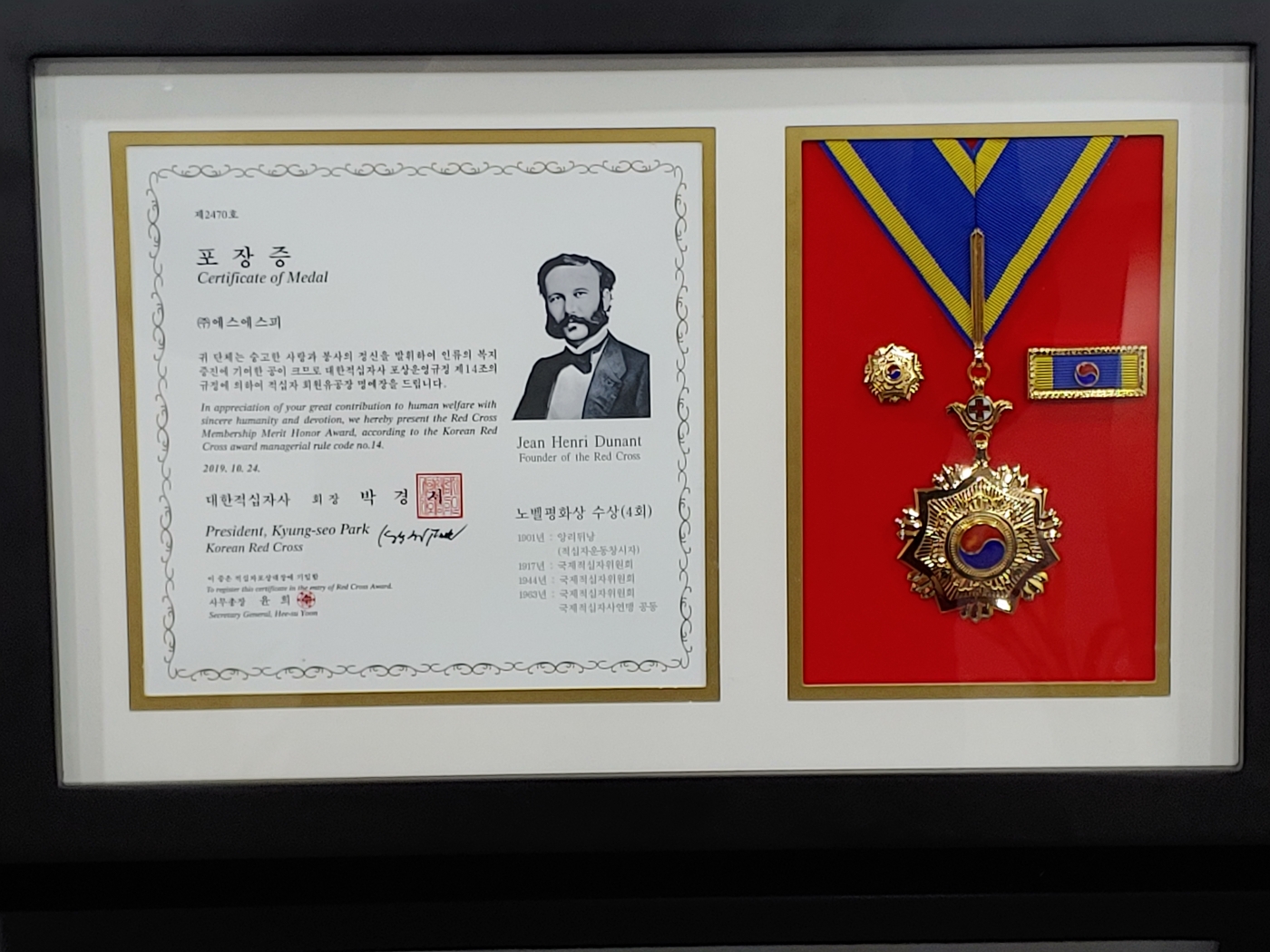 우리 에스에스피가 기부 등 사회공헌 활동에 대한 공로를 인정받아, 대한적십자사로부터 작년 금장수상에 이어 2019년도에는 영예의 최고명예장을 수여 받았습니다.