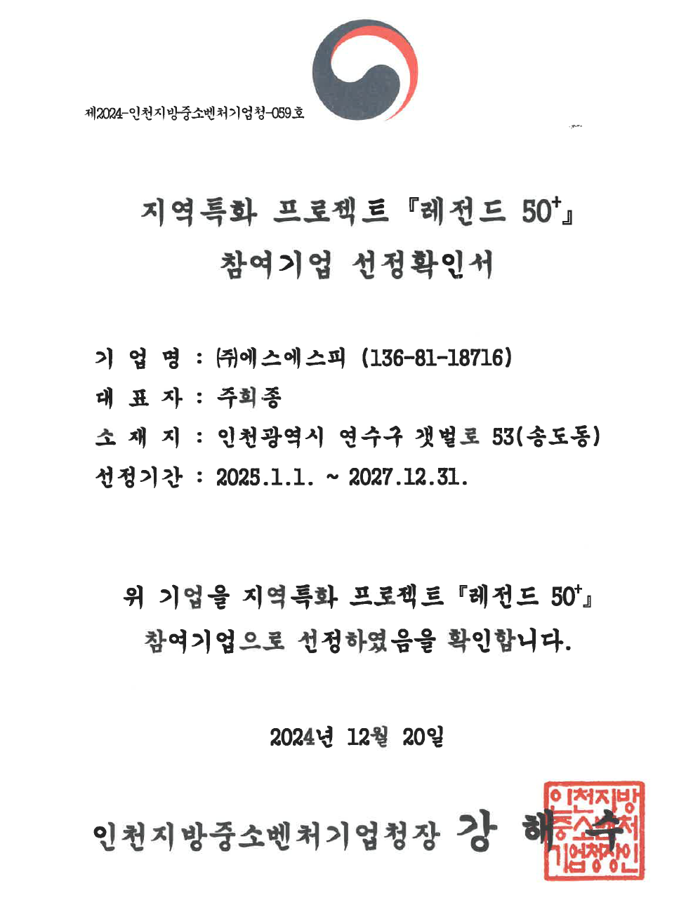 '지역특화 프로젝트 레전드50+ 참여기업 선정’ 사업에 선정된 SSP는 우수한 기술력과 성장 잠재력을