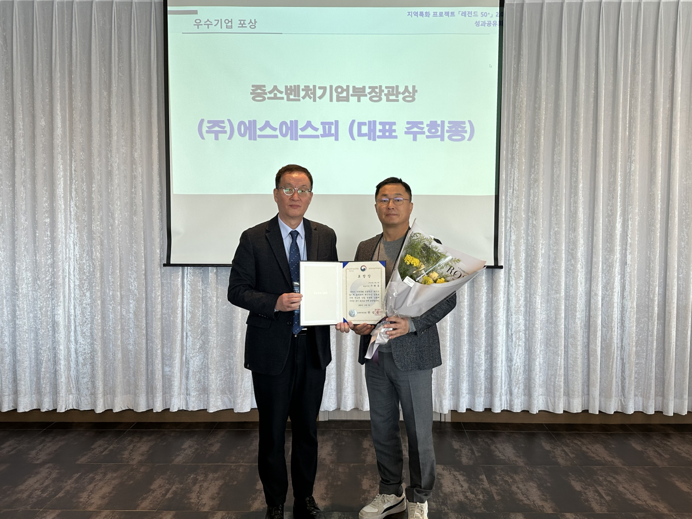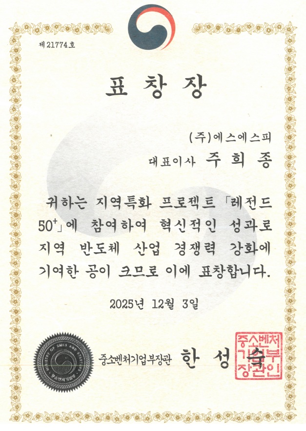 (주)에스에스피 대표 주희종님이 레전드50+ 사업을 통해 지역 반도체 산업 경쟁력 강화에 기여한 공로로 중소벤처기업부장관 표창을 수상했습니다. 이번 표창은 레전드50+ 참여를 통한 혁신적 성과를 인정받은 결과입니다. 당사는 이번 수상을 계기로 지역 산업 발전과 기술 혁신에 더욱 매진하겠습니다.